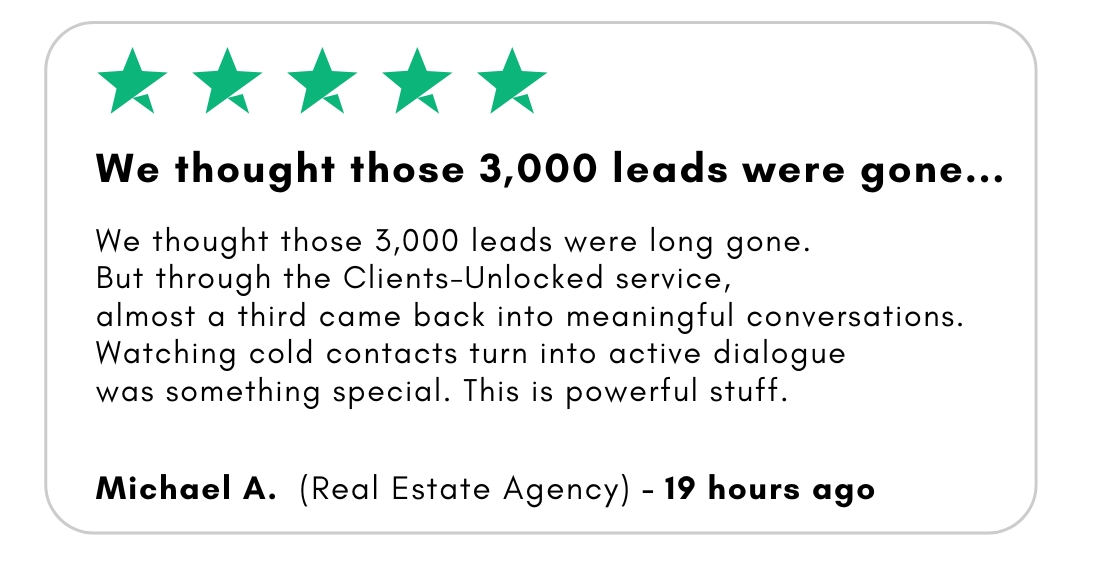 Everything you need to reactivate dormant leads, restart real conversations, and turn silent contacts into high-value clients in as little as 28 days…